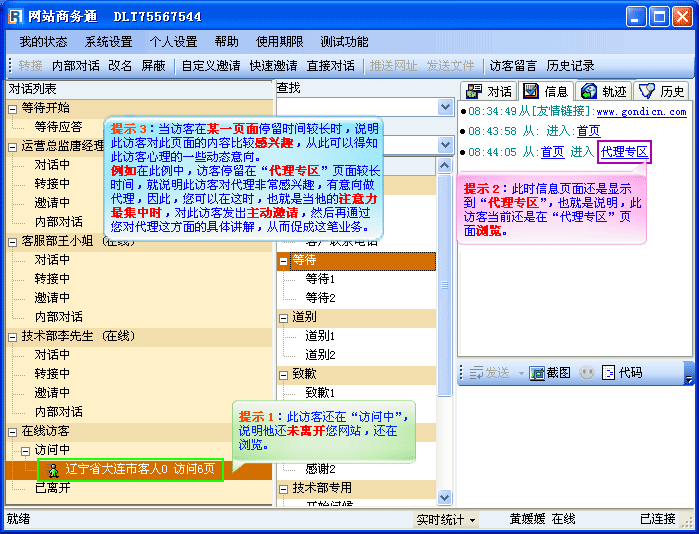 利用“轨迹跟踪”的功能您可以在了解访客的意向后对访客发出主动邀请,从而可以使您的客户接待更具有针对性和目的性,如(图2);