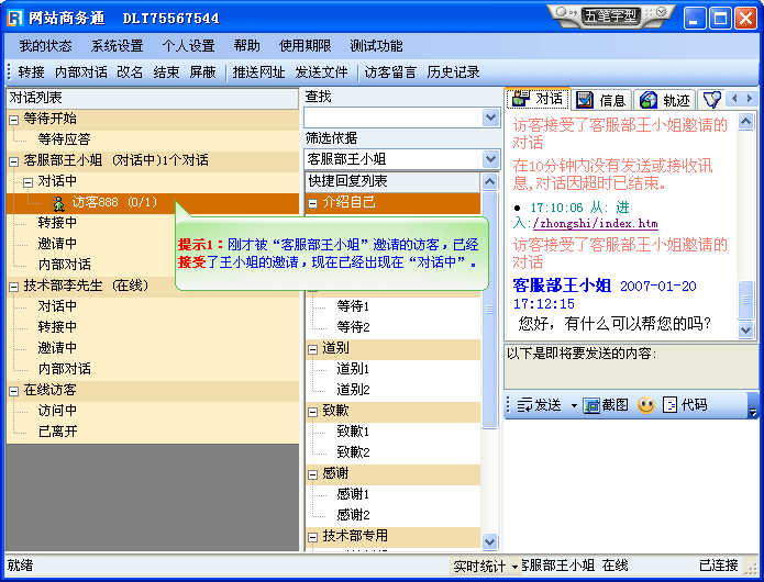 此时,客服端软件中“访客888”会由“邀请中”转为“对话中”来,如(图7)