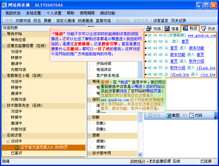 利用“轨迹跟踪”的功能您可以在了解访客的意向后对访客发出主动邀请,从而可以使您的客户接待更具有针对性和目的性,如(图2);