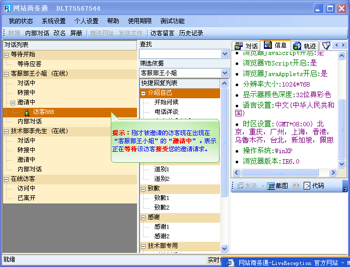 此时,客服端软件中“访客888”会由“邀请中”转为“对话中”来,如(图7)